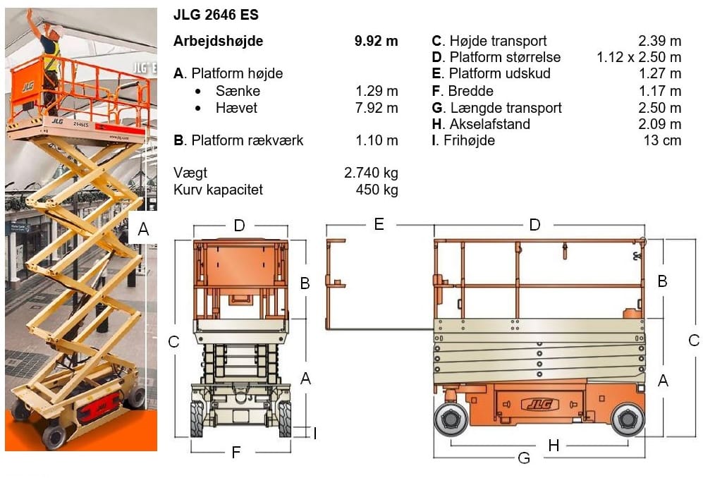 JLG 2646ES elsaxlift er CO2-reduceret og støjsvag, ideel til trange områder. Platformen måler 1,12 x 2,50 m og kan forlænges med 1,27 m. Den har en arbejdshøjde på 9,92 m og en løftekapacitet på 450 kg. Med en bredde på kun 117 cm er den velegnet til høje, snævre indendørs opgaver som i indkøbscentre og messecentre. Liften har afsmitningsfrie dæk og et nedfældeligt gelænder, der reducerer transporthøjden til 190 cm, og kan bruges udendørs med en belastning på 230 kg.